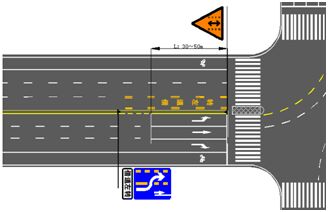 (1)開(kāi)口端至停止線距離應(yīng)結(jié)合路口導(dǎo)向車(chē)道線長(zhǎng)度,建議長(zhǎng)度30~50m。