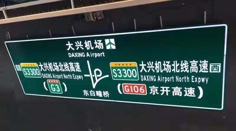 北京大興國際場外圍道路已重新規(guī)劃布局,相應(yīng)道路拖延延伸,路徑指引標(biāo)志系統(tǒng)采用最先進(jìn)的LED主動發(fā)光交通標(biāo)志,標(biāo)志實(shí)現(xiàn)時(shí)空同步,同一塊標(biāo)志中既顯示到達(dá)大興機(jī)場距離,又讀取高德通行數(shù)據(jù),測算出平均車速,給出達(dá)到大興機(jī)場的時(shí)間,方便駕駛?cè)藛T有效規(guī)劃路徑、全天候視認(rèn)標(biāo)志版面,目前已全部完工、交付。