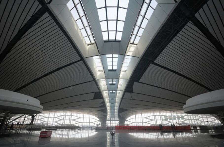 俯瞰北京大興國際機(jī)場,就像一只展翅欲飛的鳳凰,咖啡黃的外體,頭尾對稱,四翅展開,一副雄越宇宙的姿態(tài),主要主要由航站區(qū)、飛行區(qū)、綜合交通中心等部分組成。屋頂采用了鋼網(wǎng)架結(jié)構(gòu),由63450根桿件和12300個(gè)球節(jié)點(diǎn)拼裝而成,從空中看,形成了一個(gè)不規(guī)則的自由曲面空間。