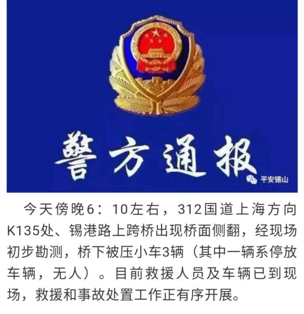 記者從無(wú)錫市錫山區(qū)警方獲悉,10月10日下午6:10左右,312國(guó)道上海方向K135處、錫港路上跨橋出現(xiàn)橋面?zhèn)确鹿剩?jīng)現(xiàn)場(chǎng)初步勘察,橋下被壓小車3輛(其中一輛系停放車輛,無(wú)人)。目前救援人員及車輛已到現(xiàn)場(chǎng),救援和事故處置工作正有序開(kāi)展。