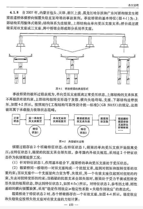 據(jù)專業(yè)標(biāo)準(zhǔn)了解,該處橋梁上部結(jié)構(gòu)采用整體式箱梁;結(jié)構(gòu)體系為連續(xù)梁,上部結(jié)構(gòu)由單向受壓支座體系;橋臺(tái)或過(guò)渡墩采用雙支座或三支座,跨中橋墩全部或部分采用單支座。該類型橋梁易被破壞的表現(xiàn)為:?jiǎn)蜗蚴軌褐ё撾x正常受壓狀態(tài),上部結(jié)構(gòu)的支承體系不再提供有效約束,上部結(jié)構(gòu)扭轉(zhuǎn)變形趨于發(fā)散、橫向失穩(wěn)垮塌,支座、下部結(jié)構(gòu)連帶損壞。參見(jiàn)行標(biāo)《公路鋼筋混凝土及預(yù)應(yīng)力 混凝土橋涵設(shè)計(jì)規(guī)范》(JTG 3362-2018)。