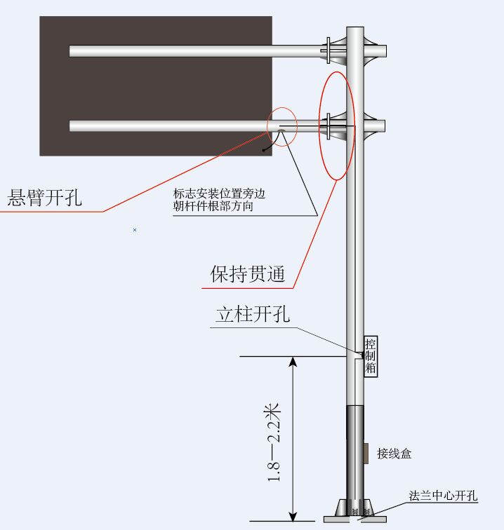 答:對(duì)于采用太陽(yáng)能供電的小型點(diǎn)陣式主動(dòng)發(fā)光標(biāo)志,所配套桿件與普通標(biāo)志無異;對(duì)于采用外接市電的主動(dòng)發(fā)光標(biāo)志,需要在懸臂下方開孔,便于標(biāo)志引線進(jìn)入懸臂管內(nèi);還需要在標(biāo)志立柱離底部法蘭約1.8米—2.5米處開孔,安裝控制機(jī)箱,便于標(biāo)志引線及外接市電入線。另若條件允許,盡量在桿件基礎(chǔ)旁設(shè)置一個(gè)接線窨井,便于外接線路好穿入桿件內(nèi)。具體見下圖: