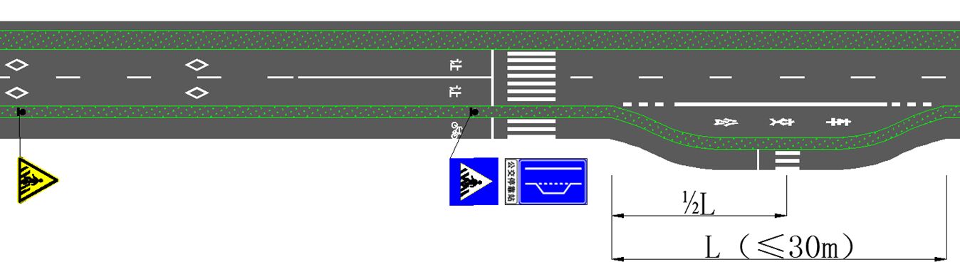 其中,站臺(tái)長(zhǎng)度≤30米的,站臺(tái)1/2處設(shè)置一道3米寬度人行橫道線,詳見(jiàn)下圖;