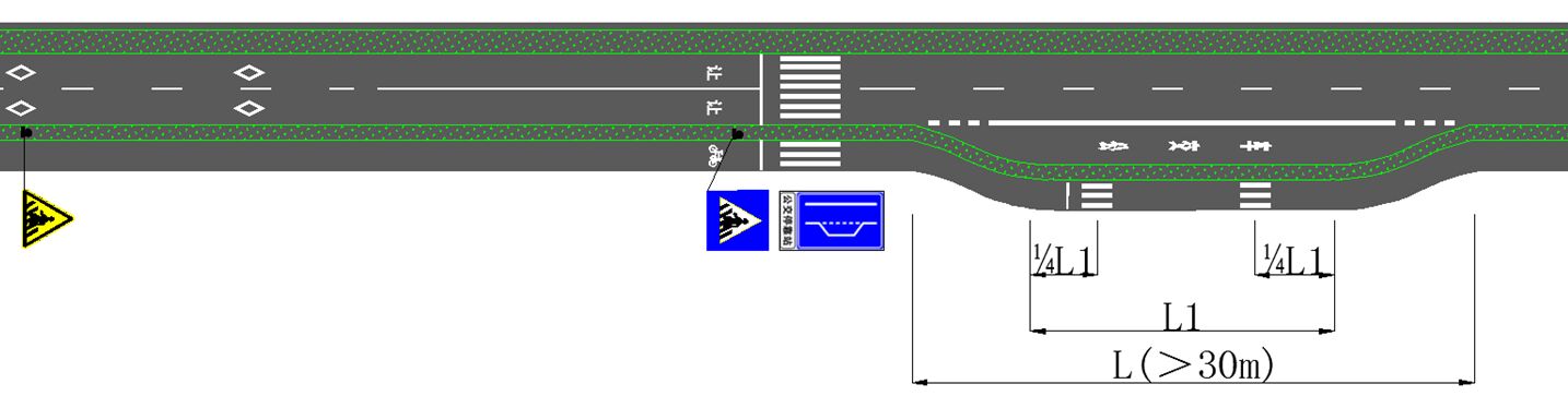 其中,站臺(tái)長(zhǎng)度>30米的,頭尾1/4處分別設(shè)置3米寬度人行橫道線,詳見(jiàn)下圖;