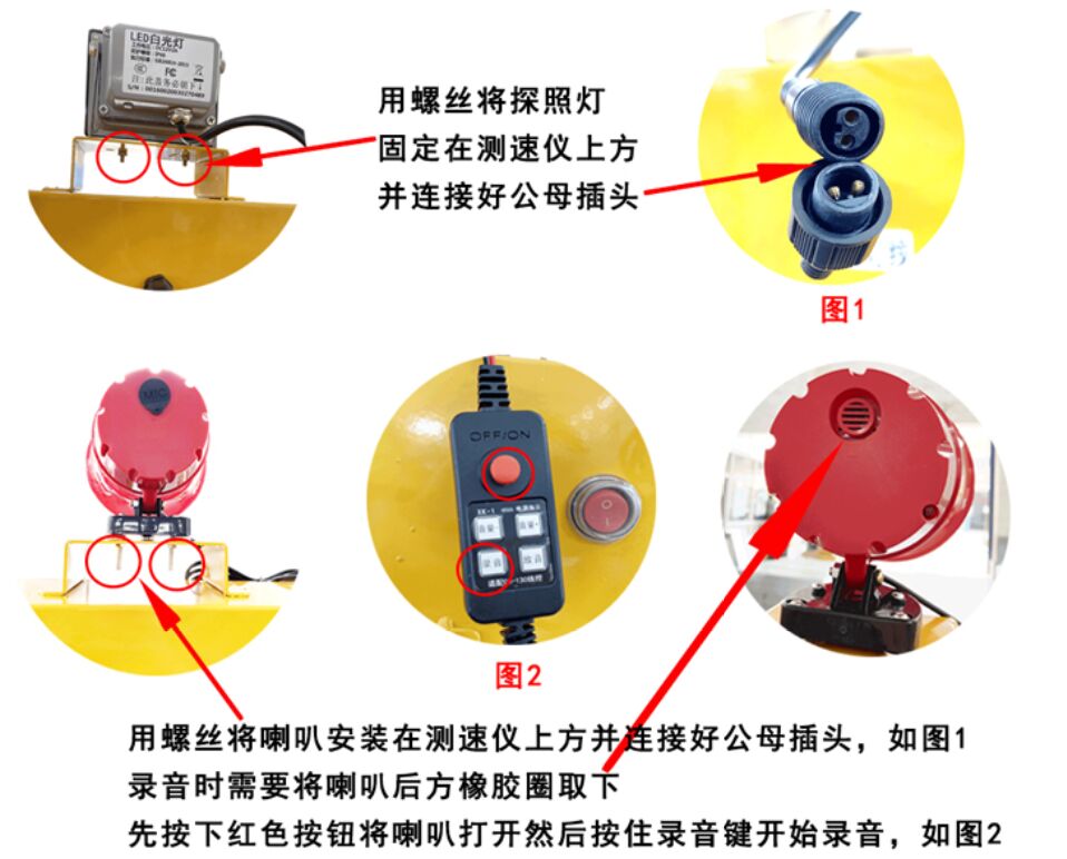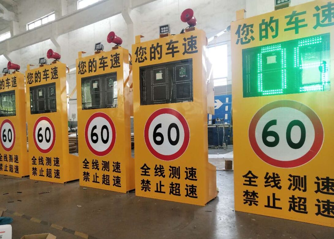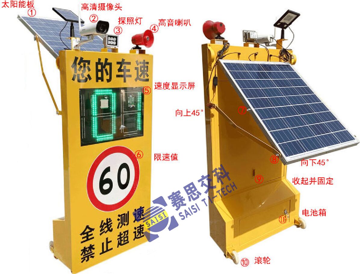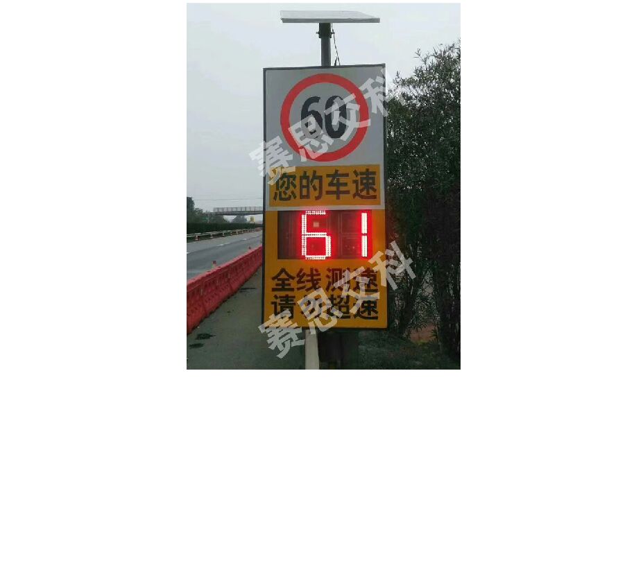 1、標(biāo)志整體為立體裝置平臺,主要包括:語音警示喇叭、速度條碼顯示屏、視頻記錄攝像頭、太陽能蓄電池供電系統(tǒng)等設(shè)備。當(dāng)被測車輛通行車速超過限制速度時,速度條碼顯示屏以紅色顯示當(dāng)前車速,并啟動語音警示喇叭告知車輛以超速行駛;當(dāng)被測車輛通行車速超過限制速度時,速度條碼顯示屏以綠色顯示當(dāng)前車速。攝像頭全天候記錄路段動態(tài)視頻,夜間開啟補光燈。該裝置對車輛超速行駛行為有較高的警示效果、特別適用于事故易發(fā)路段、團(tuán)霧頻發(fā)路段、需加強管理路段。