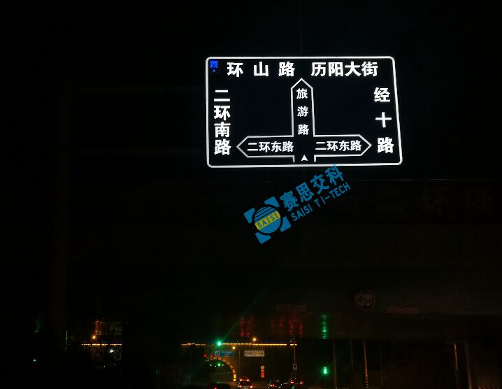 指路標(biāo)志,作為道路路名、關(guān)鍵交通節(jié)點的重要指示信息載體,通常設(shè)置于道路交叉口進口方向,對前方交叉口的相交路名信息、遠點信息進行提前的預(yù)告,便于司機及時獲取關(guān)聯(lián)道路信息,及時修正駕駛方向,實現(xiàn)準(zhǔn)確達到目的地的行車目標(biāo)。所以指路標(biāo)志具備遠距離辨認(rèn)性、全天候視認(rèn)性、和在交叉口易發(fā)現(xiàn)性顯得尤其重要,設(shè)計師在選用半透式主動發(fā)光標(biāo)志,正是出于以上的特殊功能性。