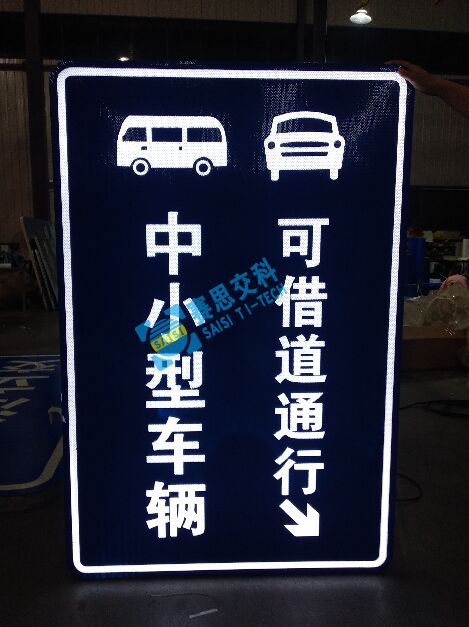 指示標(biāo)志,通常包括:路名(地點)確認(rèn)標(biāo)志、道路功能指示標(biāo)志(如:車道行駛標(biāo)志)、道路屬性標(biāo)志(如:非機動車道標(biāo)志)、行駛方向指示標(biāo)志(如:右下行駛標(biāo)志)等。該類標(biāo)志通常版面尺寸較小,但所載信息重要關(guān)鍵。在城市道路中,到處充斥著各種廣告標(biāo)志、宣傳標(biāo)志、店名標(biāo)志等,指示標(biāo)志在其中,常常不易被發(fā)現(xiàn),運用半透式主動發(fā)光標(biāo)志,使該類標(biāo)志主動發(fā)光,在夜晚或光照不佳的環(huán)境中,能主動發(fā)光標(biāo)志,極易被捕捉發(fā)現(xiàn),這是交通安全設(shè)計師非??粗氐奶厥饣δ軆?yōu)勢。