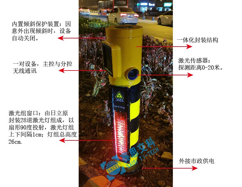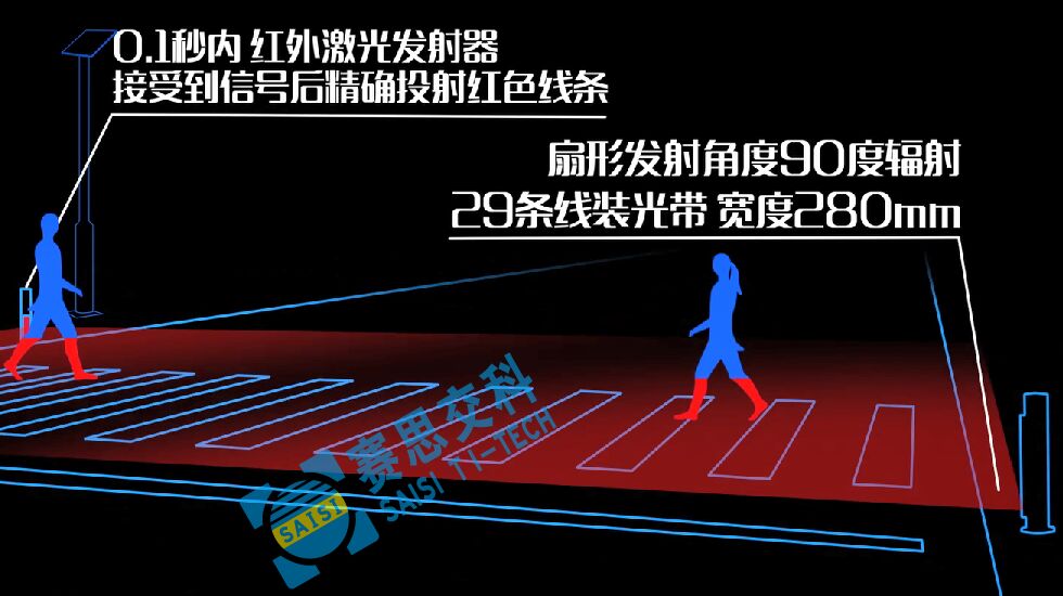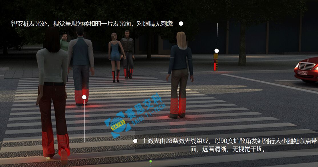 當(dāng)行人即將進(jìn)入斑馬線將要過(guò)街的瞬間,本裝置快速、準(zhǔn)確檢測(cè)到有行人過(guò)街,立刻投射28條紅色激光線到過(guò)街行人小腿處,形成明顯的紅色區(qū)域投影警示,機(jī)動(dòng)車駕駛員可以在照明不足、注意力不集中或視線受影響情況下(對(duì)面車輛遠(yuǎn)光、雨霧天氣等),遠(yuǎn)距離得到紅色警示和發(fā)現(xiàn)行人動(dòng)態(tài),并及時(shí)做出反應(yīng),從而減少交通意外的發(fā)生。