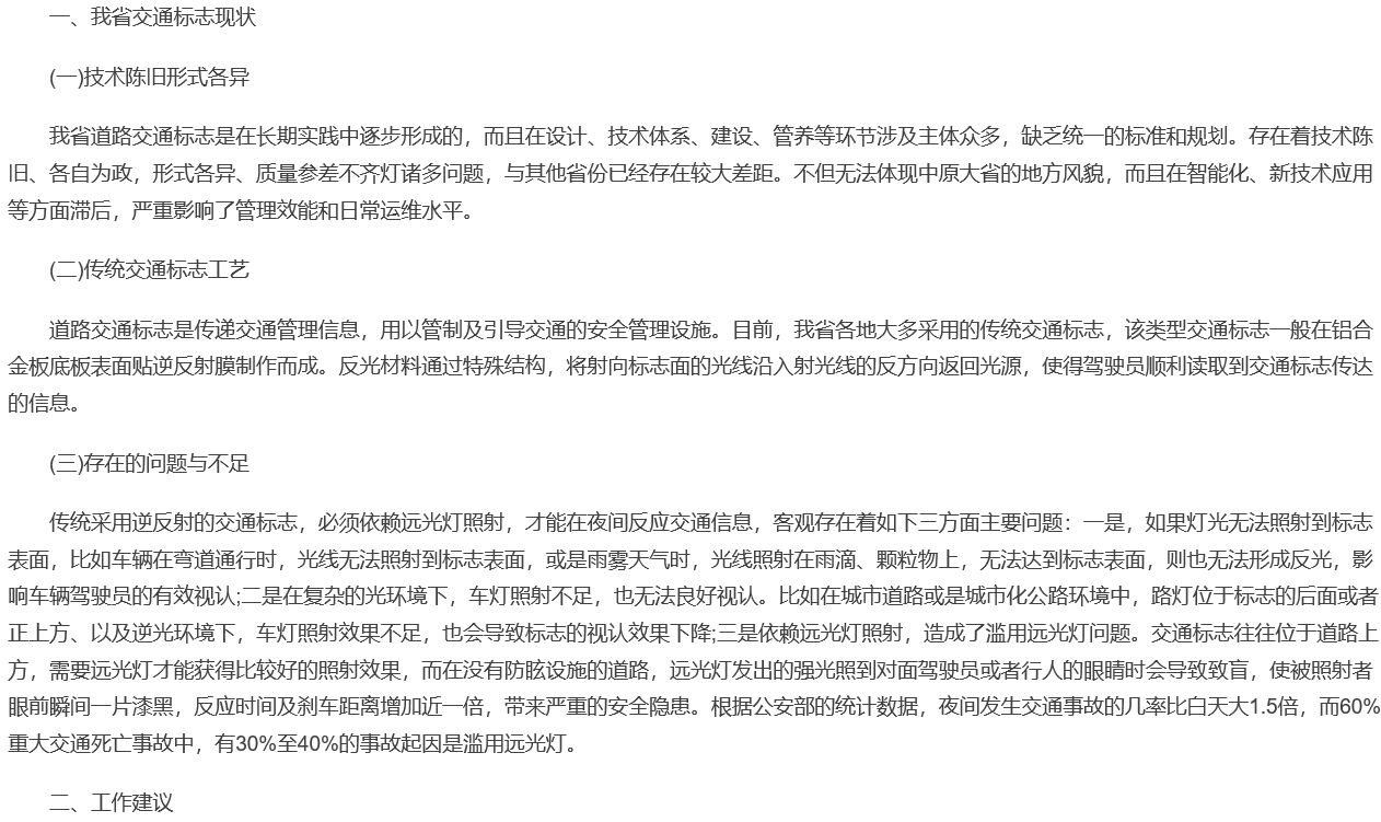傳統(tǒng)的逆反射交通標(biāo)志,在特殊的交通環(huán)境種,存在功能的局限性。《人民交通網(wǎng)》于2022年1月12日發(fā)文《關(guān)于編制統(tǒng)一的交通標(biāo)志設(shè)置規(guī)范 推廣應(yīng)用主動(dòng)發(fā)光交通標(biāo)志》中提到:“傳統(tǒng)采用逆反射的交通標(biāo)志,必須依賴遠(yuǎn)光燈照射,才能在夜間反應(yīng)交通信息,客觀存在著如下三方面主要問題:一是,如果燈光無法照射到標(biāo)志表面,比如車輛在彎道通行時(shí),光線無法照射到標(biāo)志表面,或是雨霧天氣時(shí),光線照射在雨滴、顆粒物上,無法達(dá)到標(biāo)志表面,則也無法形成反光,影響車輛駕駛員的有效視認(rèn);二是在復(fù)雜的光環(huán)境下,車燈照射不足,也無法良好視認(rèn)。比如在城市道路或是城市化公路環(huán)境中,路燈位于標(biāo)志的后面或者正上方、以及逆光環(huán)境下,車燈照射效果不足,也會(huì)導(dǎo)致標(biāo)志的視認(rèn)效果下降;三是依賴遠(yuǎn)光燈照射,造成了濫用遠(yuǎn)光燈問題。交通標(biāo)志往往位于道路上方,需要遠(yuǎn)光燈才能獲得比較好的照射效果,而在沒有防眩設(shè)施的道路,遠(yuǎn)光燈發(fā)出的強(qiáng)光照到對面駕駛員或者行人的眼睛時(shí)會(huì)導(dǎo)致致盲,使被照射者眼前瞬間一片漆黑,反應(yīng)時(shí)間及剎車距離增加近一倍,帶來嚴(yán)重的安全隱患。根據(jù)公安部的統(tǒng)計(jì)數(shù)據(jù),夜間發(fā)生交通事故的幾率比白天大1.5倍,而60%重大交通死亡事故中,有30%至40%的事故起因是濫用遠(yuǎn)光燈?!?。