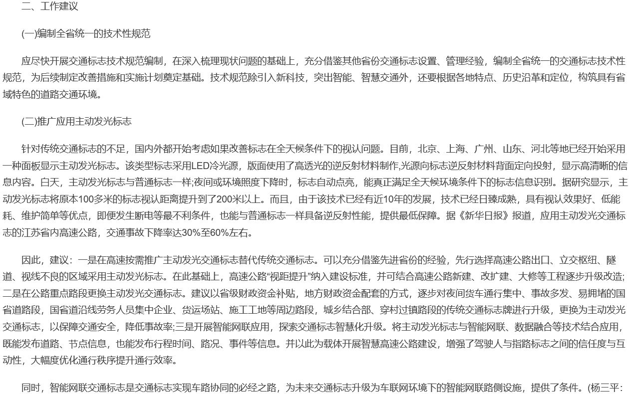 主動(dòng)發(fā)光標(biāo)志,因其具備獨(dú)特的功能優(yōu)勢,主要有:(1)能主動(dòng)發(fā)光,不需依賴汽車遠(yuǎn)光燈照射;(2)提升標(biāo)志的遠(yuǎn)距離視認(rèn)性;(3)增強(qiáng)標(biāo)志的易捕捉性和警示性;(4)增強(qiáng)標(biāo)志在雨、霧、冰、雪、霾、逆光等惡劣交通環(huán)境中,仍能保持良好的顯示效果。上述功能能彌補(bǔ)在特殊交通環(huán)境中普通逆反射標(biāo)志的功能不足現(xiàn)象。為此,文中還給出相關(guān)建議:“一是在高速按需推廣主動(dòng)發(fā)光交通標(biāo)志替代傳統(tǒng)交通標(biāo)志。可以充分借鑒先進(jìn)省份的經(jīng)驗(yàn),先行選擇高速公路出口、立交樞紐、隧道、視線不良的區(qū)域采用主動(dòng)發(fā)光標(biāo)志。在此基礎(chǔ)上,高速公路“視距提升”納入建設(shè)標(biāo)準(zhǔn),并可結(jié)合高速公路新建、改擴(kuò)建、大修等工程逐步升級(jí)改造;二是在公路重點(diǎn)路段更換主動(dòng)發(fā)光交通標(biāo)志。建議以省級(jí)財(cái)政資金補(bǔ)貼,地方財(cái)政資金配套的方式,逐步對夜間貨車通行集中、事故多發(fā)、易擁堵的國省道路段,國省道沿線勞務(wù)人員集中企業(yè)、貨運(yùn)場站、施工工地等周邊路段,城鄉(xiāng)結(jié)合部、穿村過鎮(zhèn)路段的傳統(tǒng)交通標(biāo)志牌進(jìn)行升級(jí),更換為主動(dòng)發(fā)光交通標(biāo)志,以保障交通安全,降低事故率;三是開展智能網(wǎng)聯(lián)應(yīng)用,探索交通標(biāo)志智慧化升級(jí)。將主動(dòng)發(fā)光標(biāo)志與智能網(wǎng)聯(lián)、數(shù)據(jù)融合等技術(shù)結(jié)合應(yīng)用,既能發(fā)布道路、節(jié)點(diǎn)信息,也能發(fā)布行程時(shí)間、路況、事件等信息。并以此為載體開展智慧高速公路建設(shè),增強(qiáng)了駕駛?cè)伺c指路標(biāo)志之間的信任度與互動(dòng)性,大幅度優(yōu)化通行秩序提升通行效率?!?br />