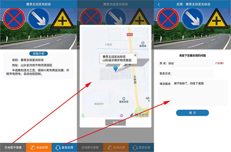 手機(jī)掃描二維碼后打開設(shè)施設(shè)備詳情頁面,可看到當(dāng)前設(shè)施設(shè)備的詳細(xì)資料,可通過地圖查看當(dāng)前位置,也可通過撥打電話、留言反饋等方式向后臺反映問題。不僅方便了公眾查詢自己當(dāng)前位置及相關(guān)情況,也方便設(shè)施設(shè)備維護(hù)機(jī)構(gòu)對出現(xiàn)問題的設(shè)施設(shè)備進(jìn)行及時維護(hù)。