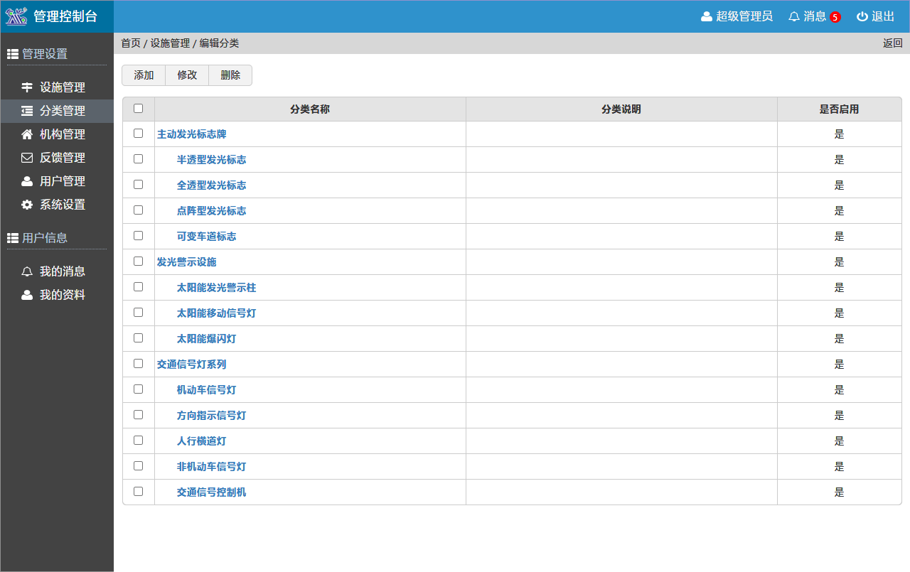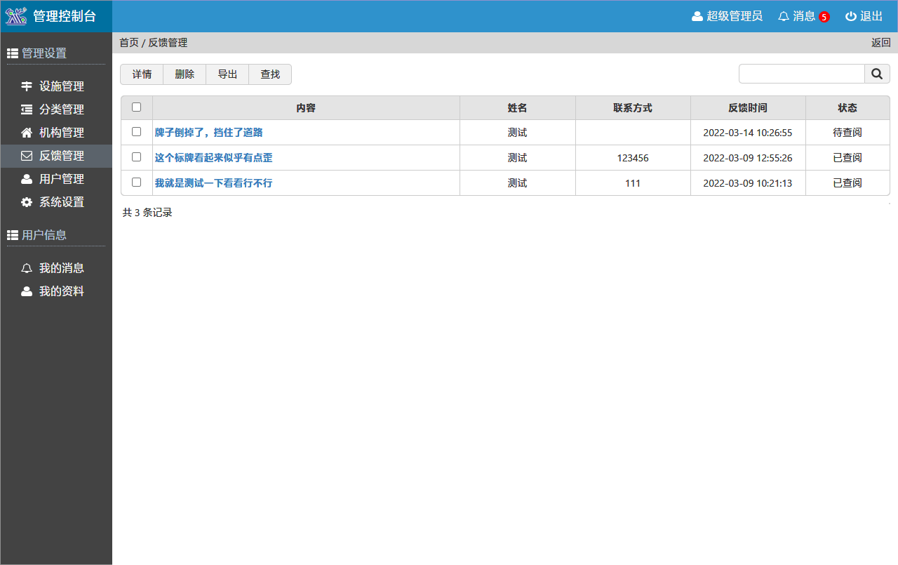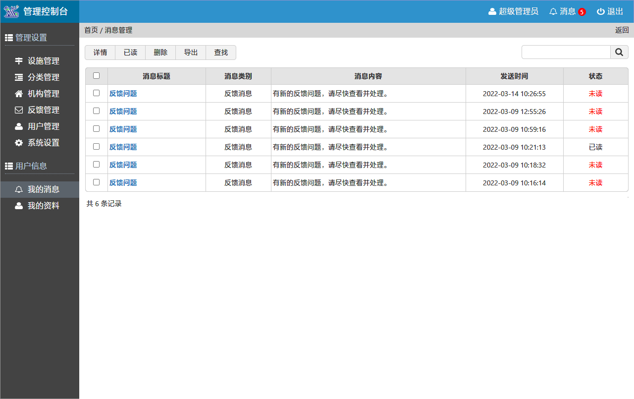 設(shè)施管理系統(tǒng)擁有完善的后臺管理功能,可按列表添加設(shè)施設(shè)備,可按層級添加分類、機(jī)構(gòu)??梢蕴砑佣鄠€管理用戶,并設(shè)置不同管理權(quán)限。當(dāng)收到反饋信息后,能及時顯示新消息數(shù)量。在反饋管理模塊中,可查看當(dāng)前反饋的信息列表,及時處理對應(yīng)問題。