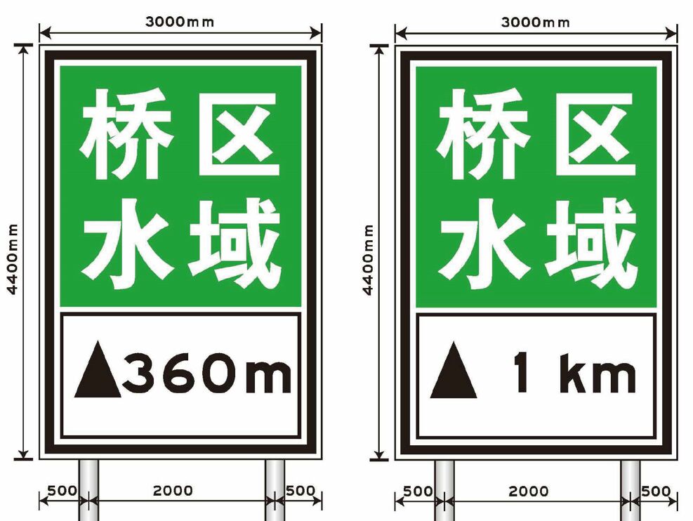 “橋區(qū)水域”航道指示標志,設置于河道兩岸合適位置,主要用于告知通行船舶注意前方橋區(qū)水域的劃定范圍,方便船舶駕駛員能準確、及時獲取航道水域相關信息。其版面分上下兩部分:上部,藍底白字(橋區(qū)水域);下部,白底黑字(三角+距離數(shù)字);整體黑色邊框。版面尺寸通常為:3000mm *4400mm。通常采用雙立柱安裝方式。如下圖所示: