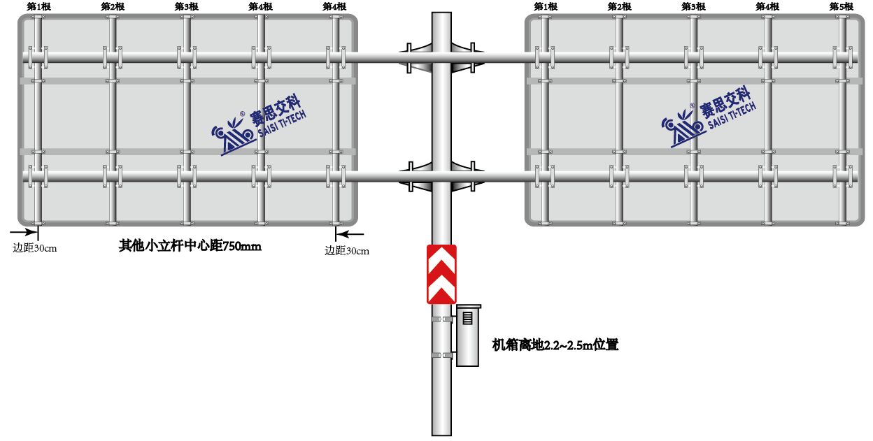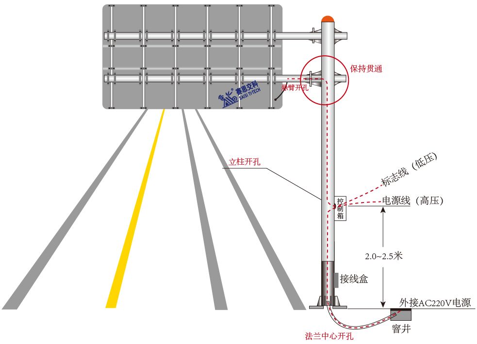 (3)安裝控制機箱。首先正確選擇待安裝標(biāo)志所對應(yīng)的機箱,不同標(biāo)志對應(yīng)不同機箱(因機箱最大承受負載不同,在機箱上貼有對應(yīng)標(biāo)志版面),不得隨意混雜機箱使用。新建桿件應(yīng)按下圖所示開孔,讓管線在桿件內(nèi)部;控制箱安裝于路外一側(cè),離低高度約為2.2~2.5米,此高度,單人無法夠著;若有故障需檢修時,人字梯也方便檢修。