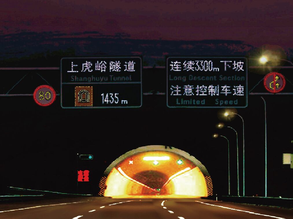 因此,在有條件的情況下,隧道及進(jìn)出路段所有交通標(biāo)志均宜采用Ⅴ類大廣角反光膜,或者采用主動發(fā)光型交通標(biāo)志,以提升交通標(biāo)志的遠(yuǎn)距離、大角度、全天候視認(rèn)功能,并通過科學(xué)、合理地增設(shè)基礎(chǔ)交通安全設(shè)施,消除特殊交通環(huán)境所衍生的安全隱患,提高隧道內(nèi)行車安全、秩序和通行效率,降低交通事故發(fā)生率,保證整個運輸系統(tǒng)的健康運行。