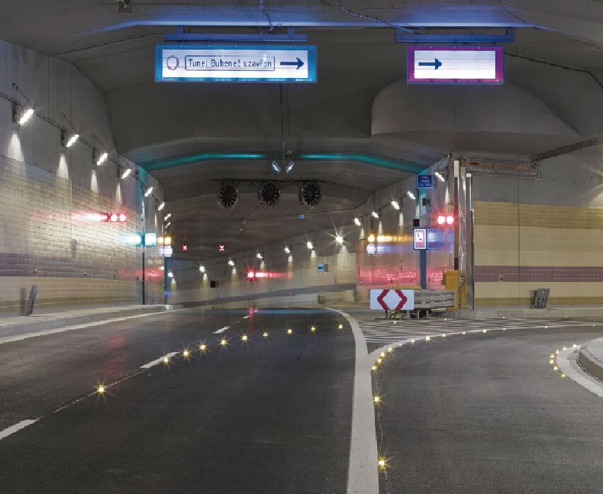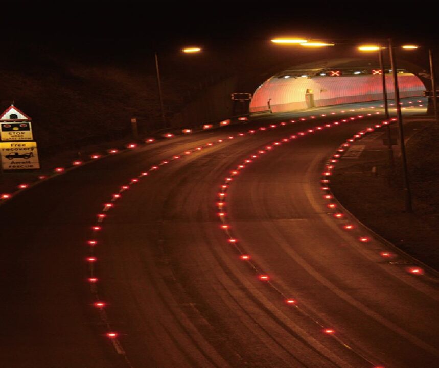 3、對于彎曲隧道路段應(yīng)設(shè)置必要的視線誘導(dǎo)設(shè)施,如主動發(fā)光誘導(dǎo)設(shè)施等 。在隧道車道中心線以及兩側(cè)邊緣線上分別設(shè)置黃色與白色被動反光道釘,隧道兩壁附著主動發(fā)光輪廓標(biāo),提示駕駛?cè)藢ο蜍嚨酪约八淼缐Ρ诘恼鎸嵨恢?,消除緊張心理。