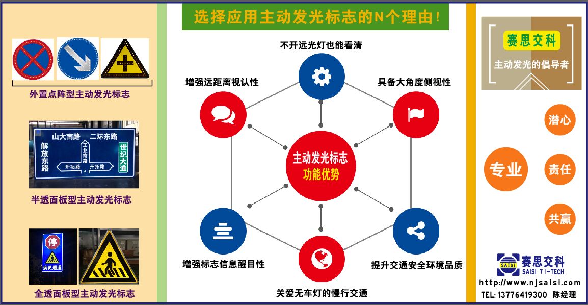 南京賽思交通信息科技有限公司,是一家專業(yè)從事交通安全研究、創(chuàng)新型交安設(shè)施研發(fā)的科技型公司,我公司研發(fā)、生產(chǎn)、銷售的主動發(fā)光標(biāo)志系列產(chǎn)品,已在全國各地的交通安全工程中廣泛使用,并在交通穩(wěn)靜化的提示、警示、管理方面取得了良好的功能效果,更多了解交通安全技術(shù)方案、創(chuàng)新交通安全產(chǎn)品,可登錄本網(wǎng)站m.kidweb.cn查閱,或致電:陳經(jīng)理,13776419300。