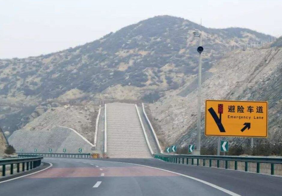 在長陡下坡路段,因車輛制動失效,而導(dǎo)致車輛失控,在行車道外側(cè)增設(shè)避險車道,供失控車輛駛離正線安全減速,規(guī)避事故危險。